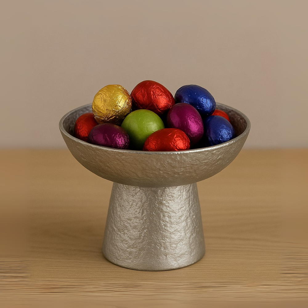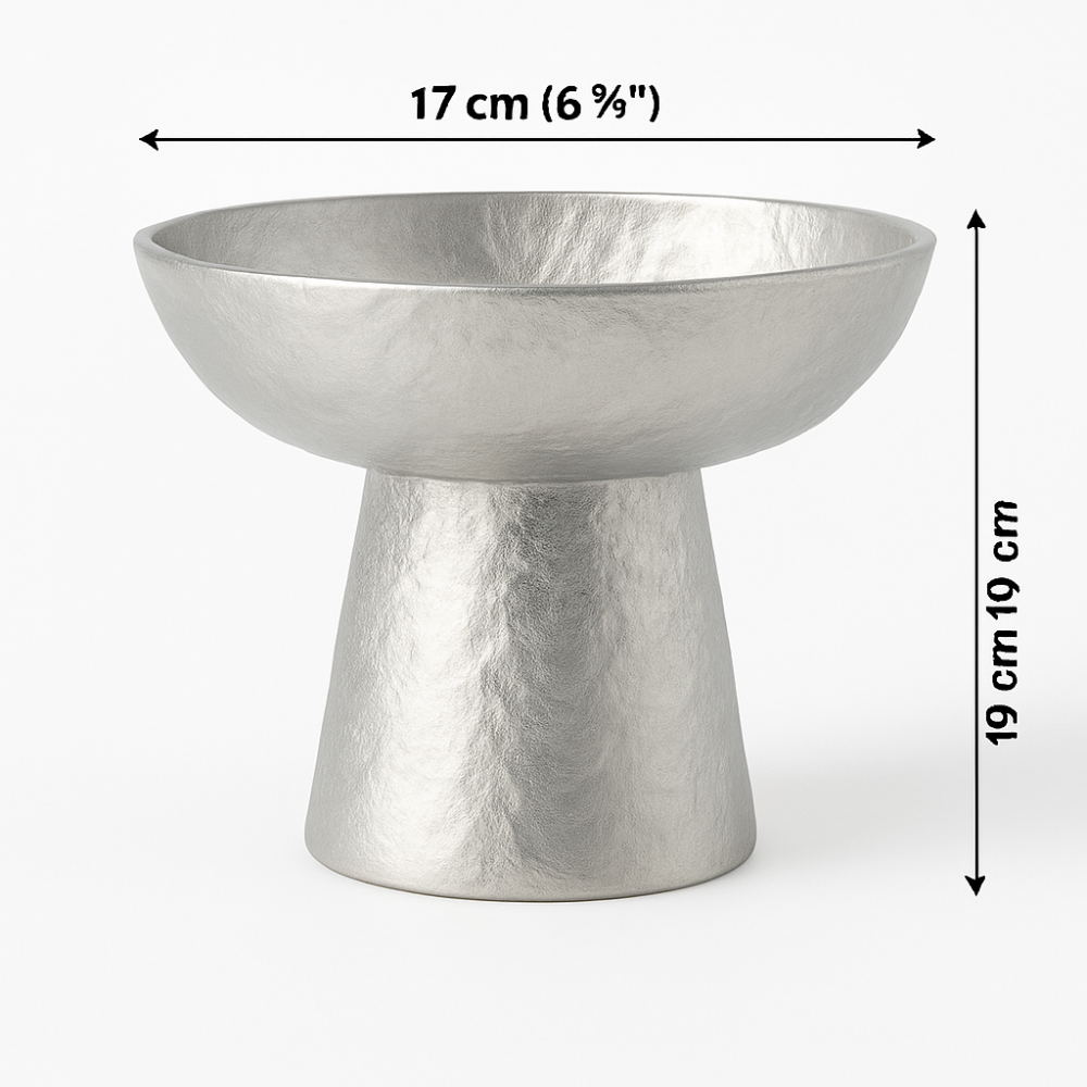 Modern simplicity meets timeless elegance in this handcrafted silver pedestal bowl by FOUR DECOR COMPANY. Featuring a matte-textured finish and a minimal silhouette, this bowl is perfect for serving fruits, chocolates, or decorative use on coffee tables, dining setups, or countertops. The elevated design not only enhances presentation but also...